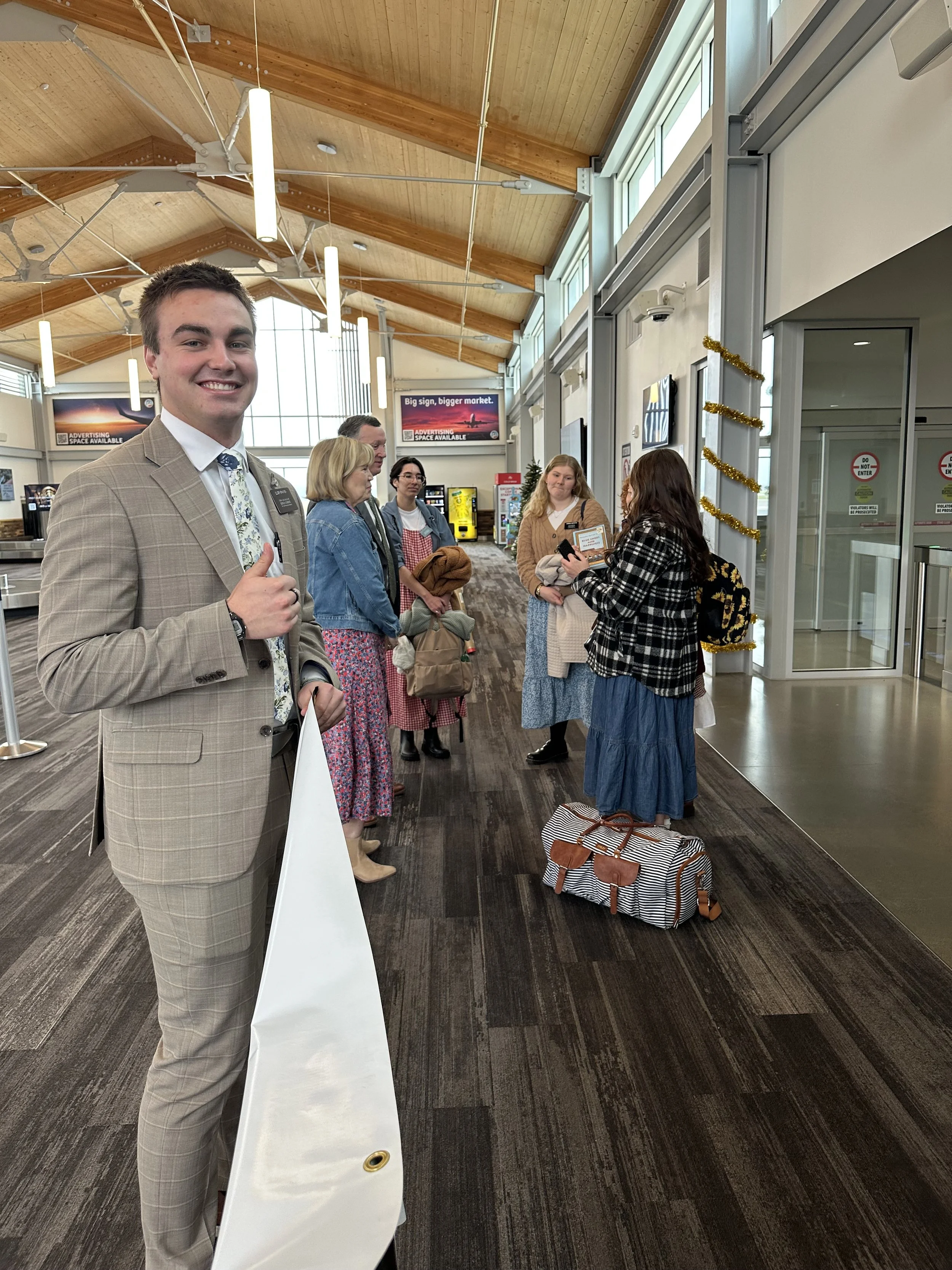Greeting new missionaries at the airport. Elder Bracken holding our welcome banner