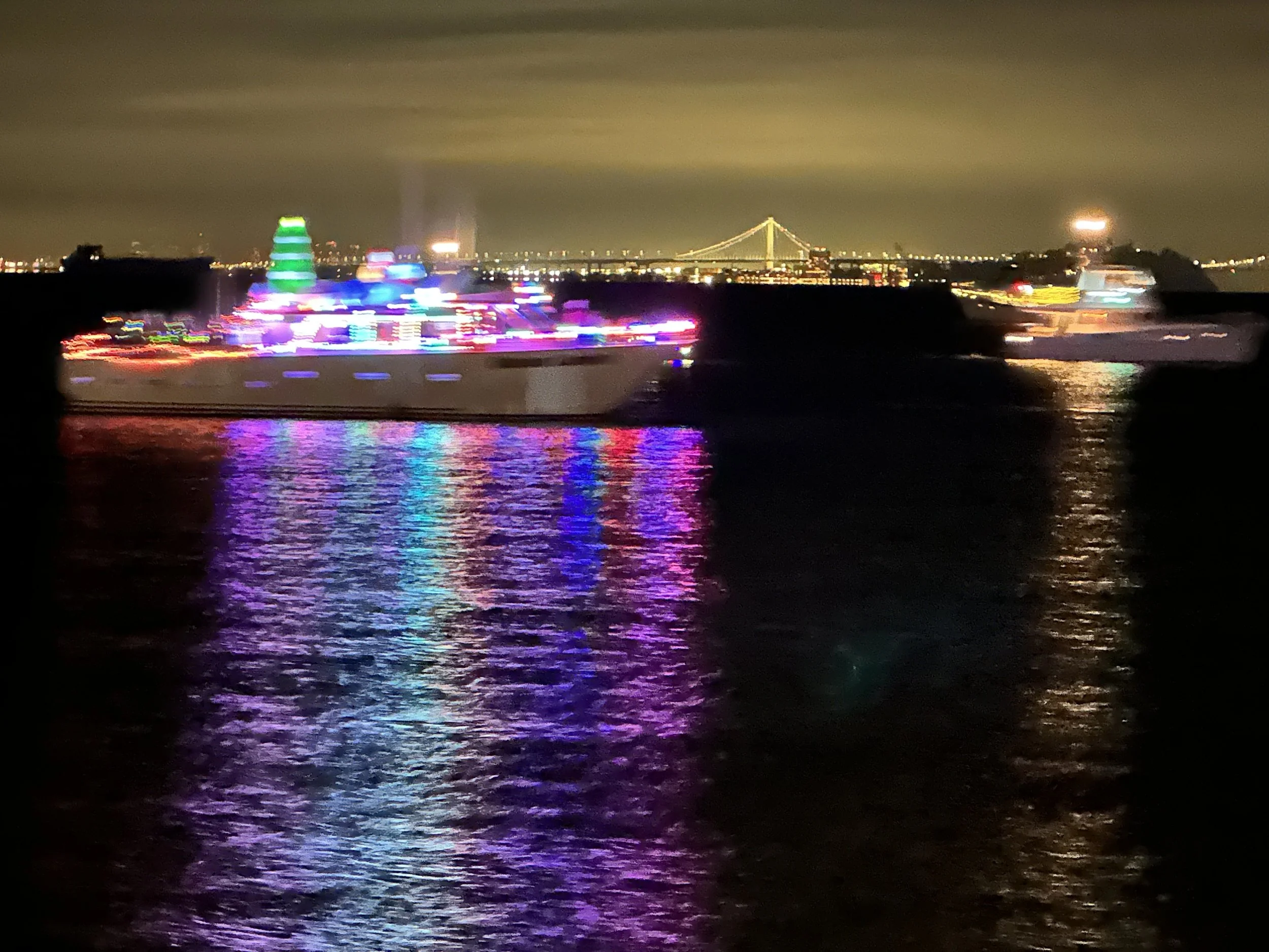 Boats lite up cruising the bay with the Bay Bridge in the background