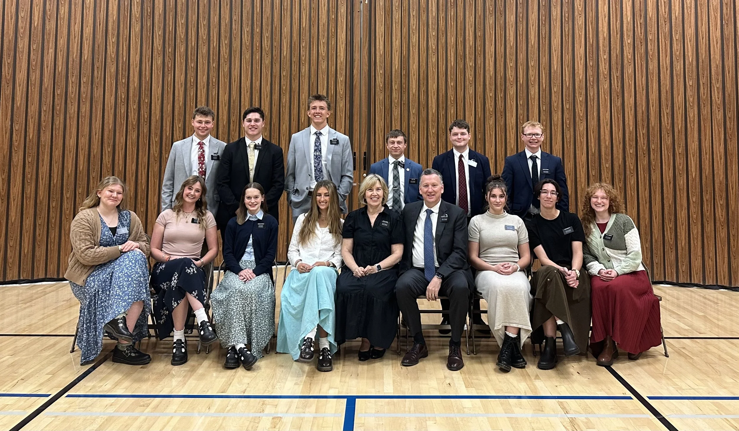 New Missionaries: Elders Merrill, Welling, Hubbard, Pyne, McIntyre, and Patterson. Sisters Winterton, Adams, Drennan, Proffitt, Sister Quinn, President Quinn, Hirschi, Brunette, and Longhurst