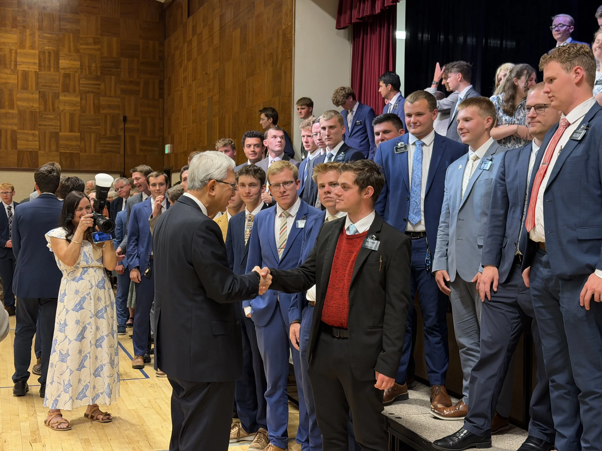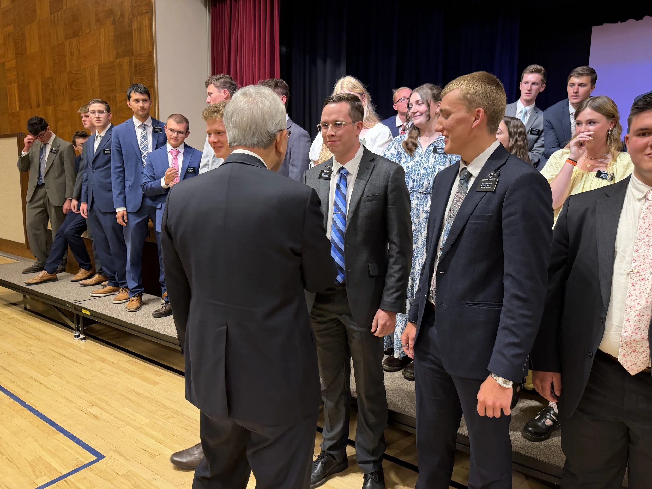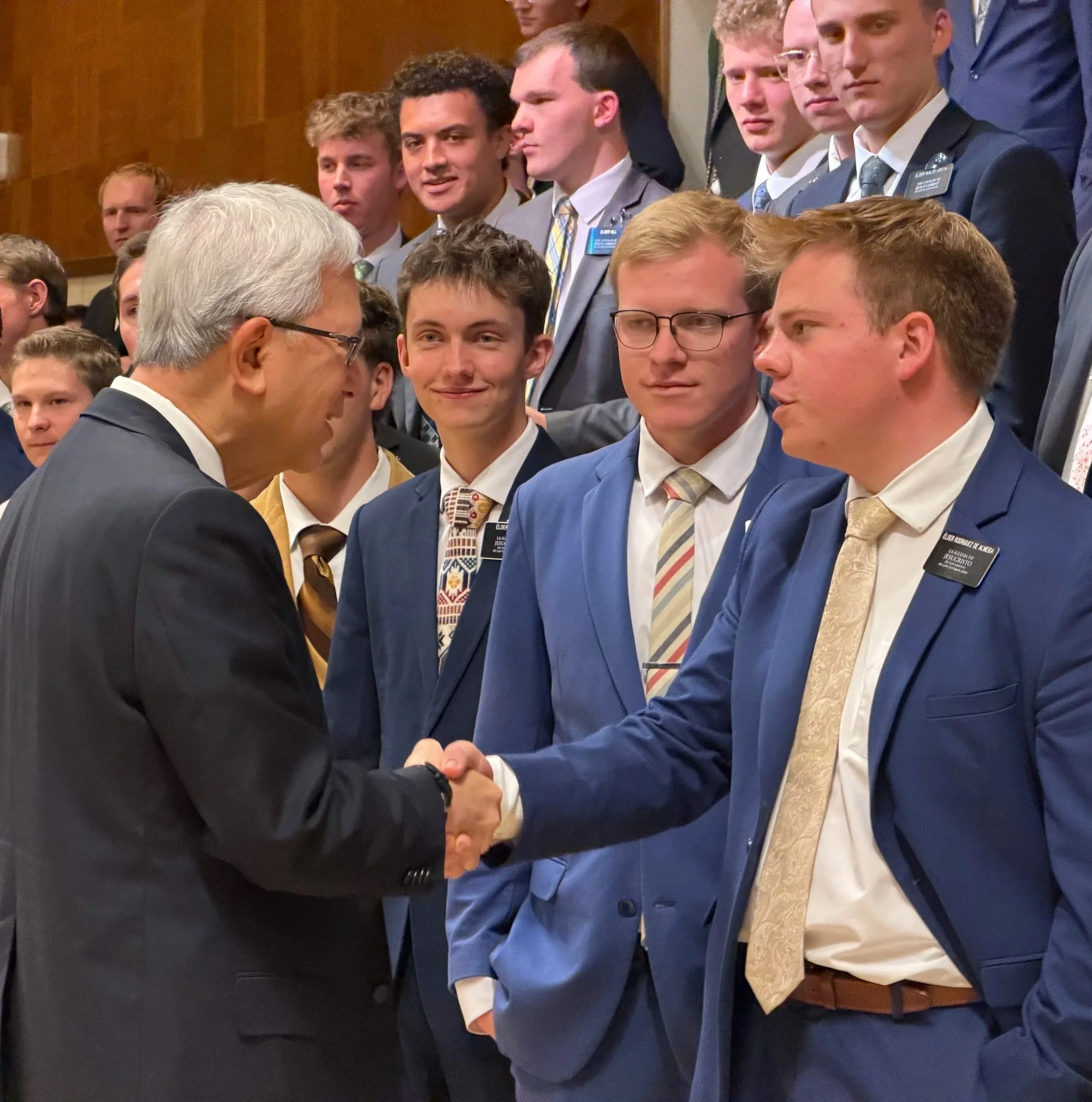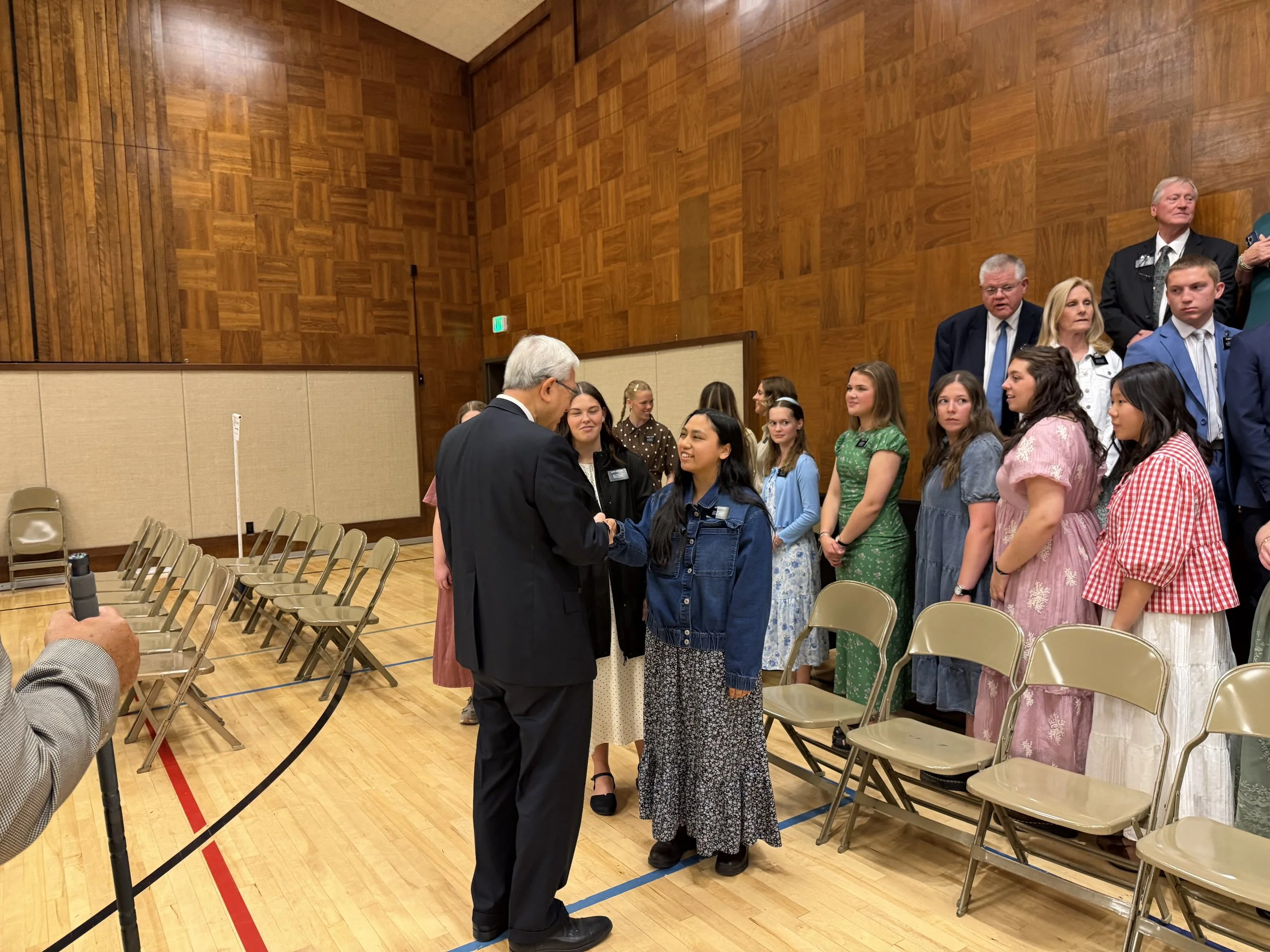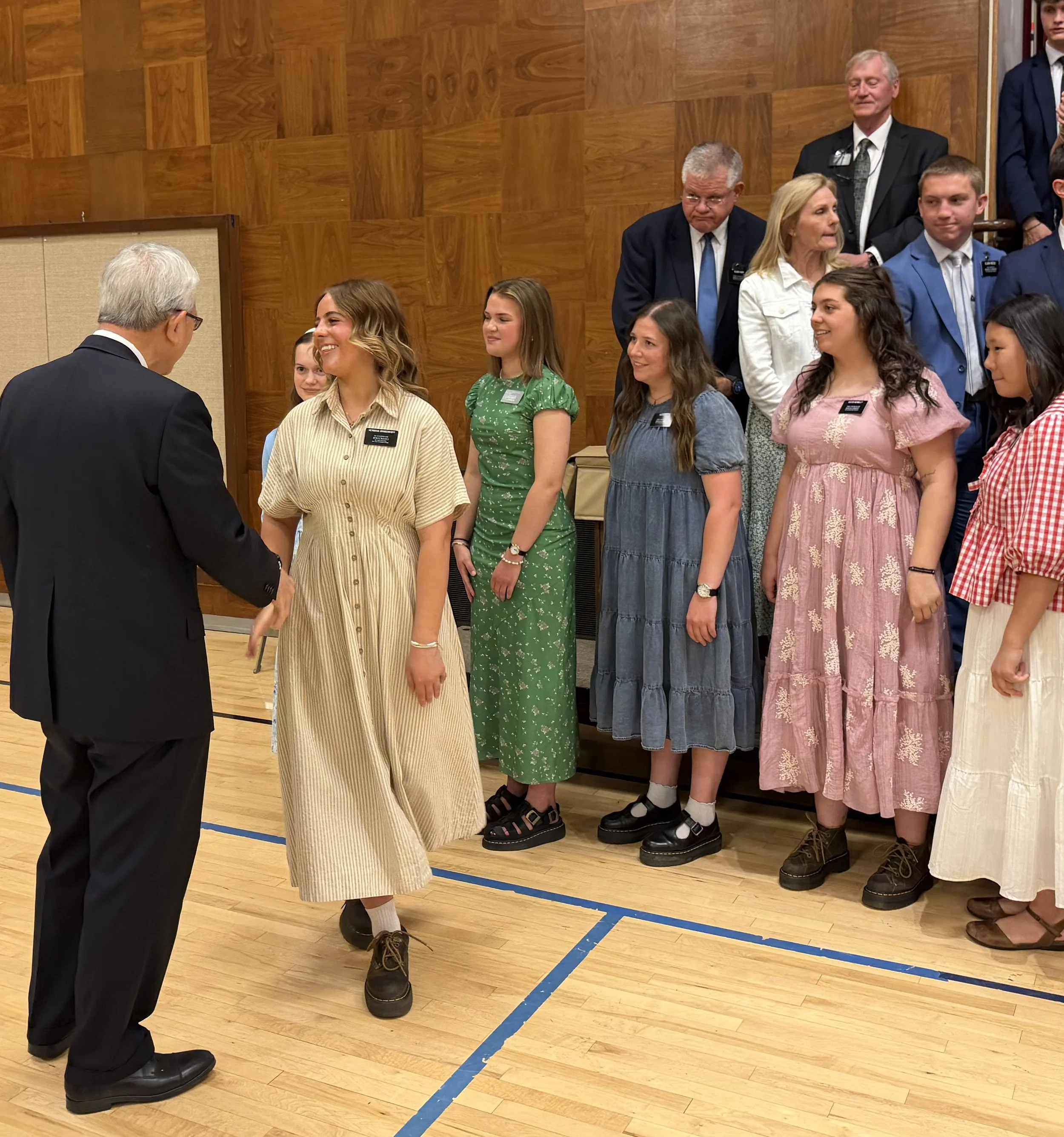 Waiting to shake hands with Elder Gong of the Quorum of Twelve Apostles