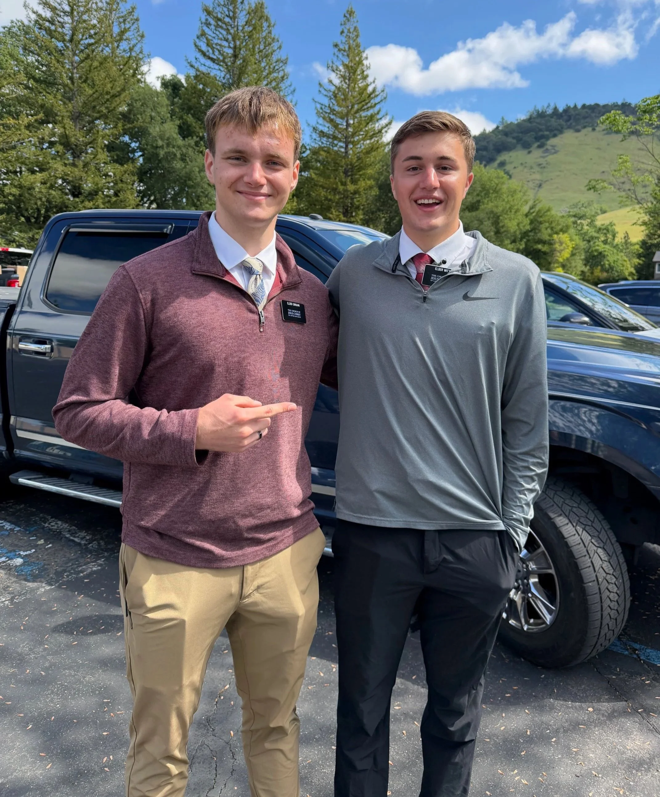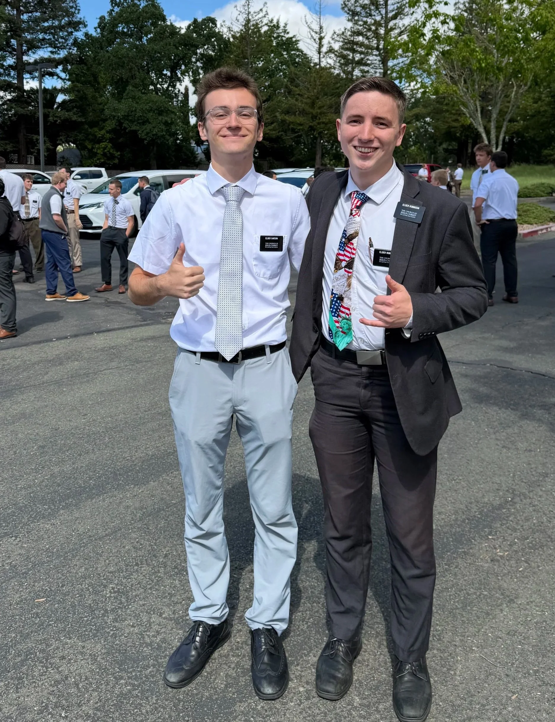 Elder Black and Elder Jensen, with “Jesus Loves Me” license plate