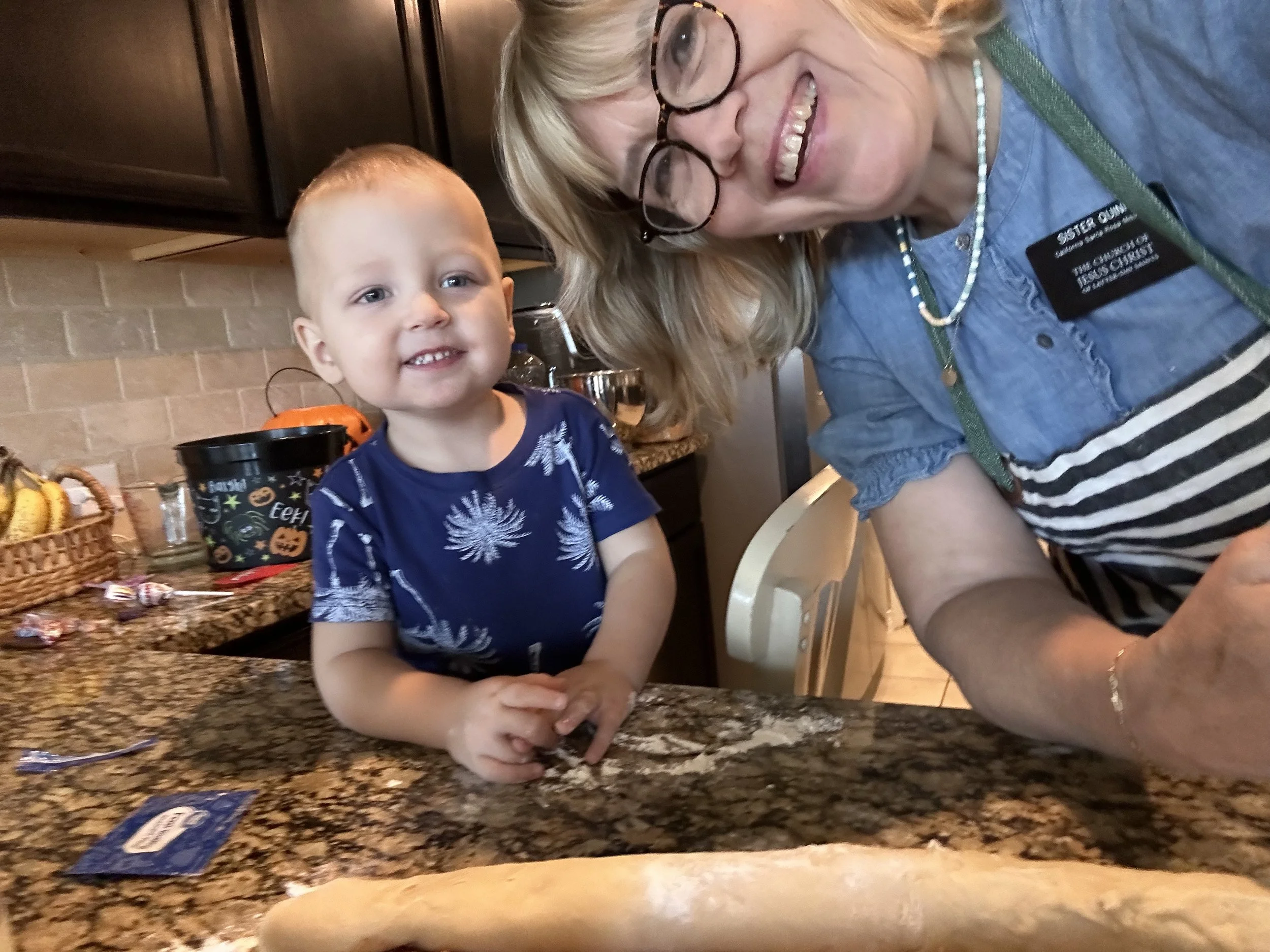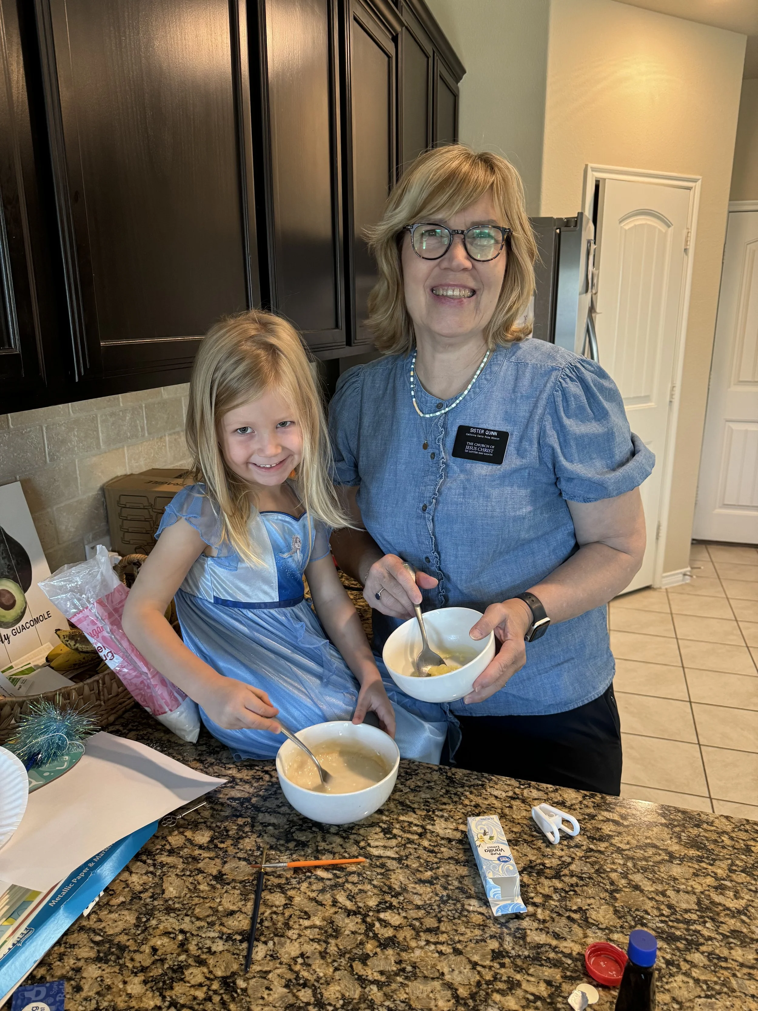 Grammy and Elaine Francis making frosting for cinnamon rolls.