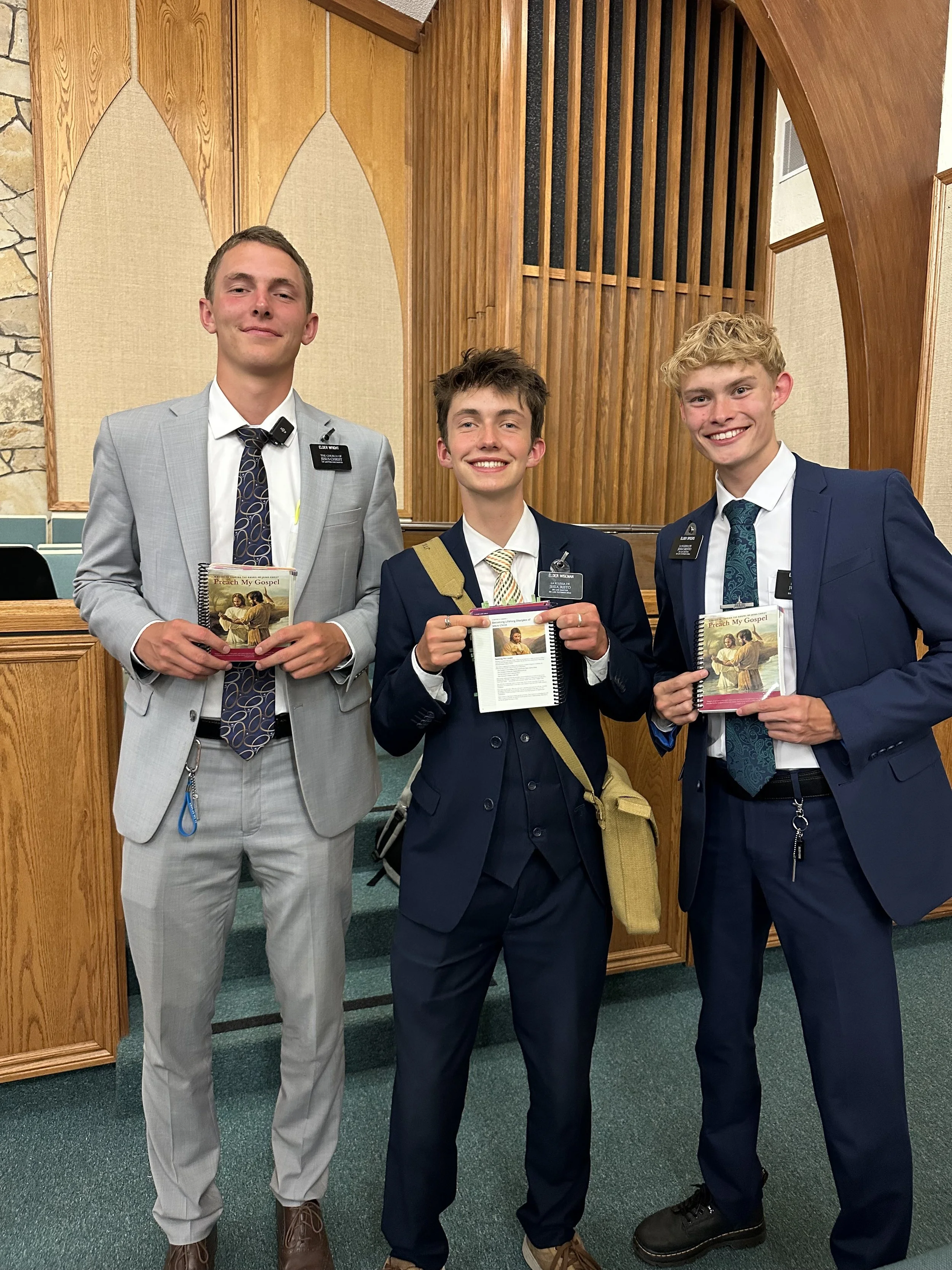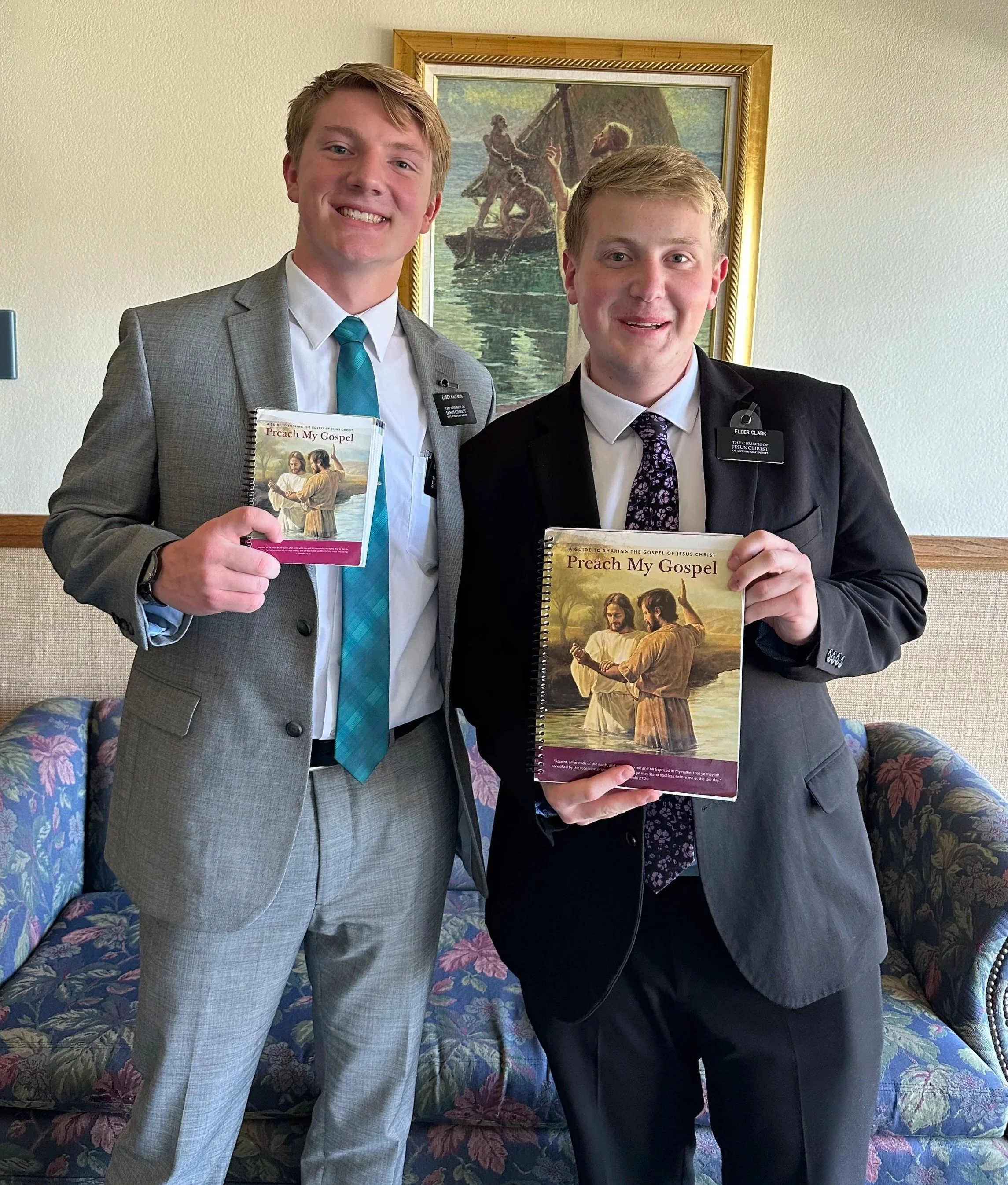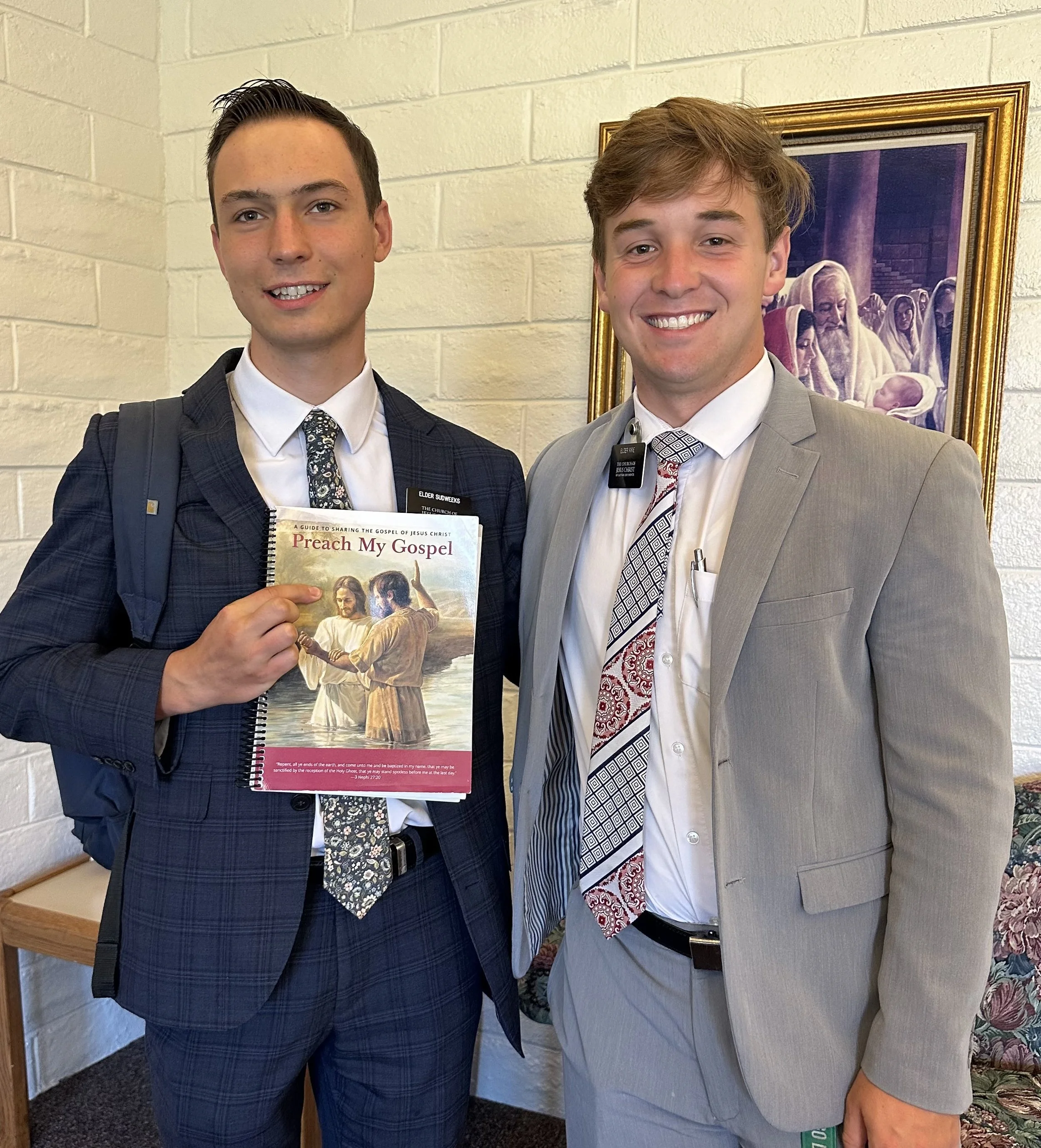 Elders Kaufman and Clark with their copies of “Preach My Gospel”