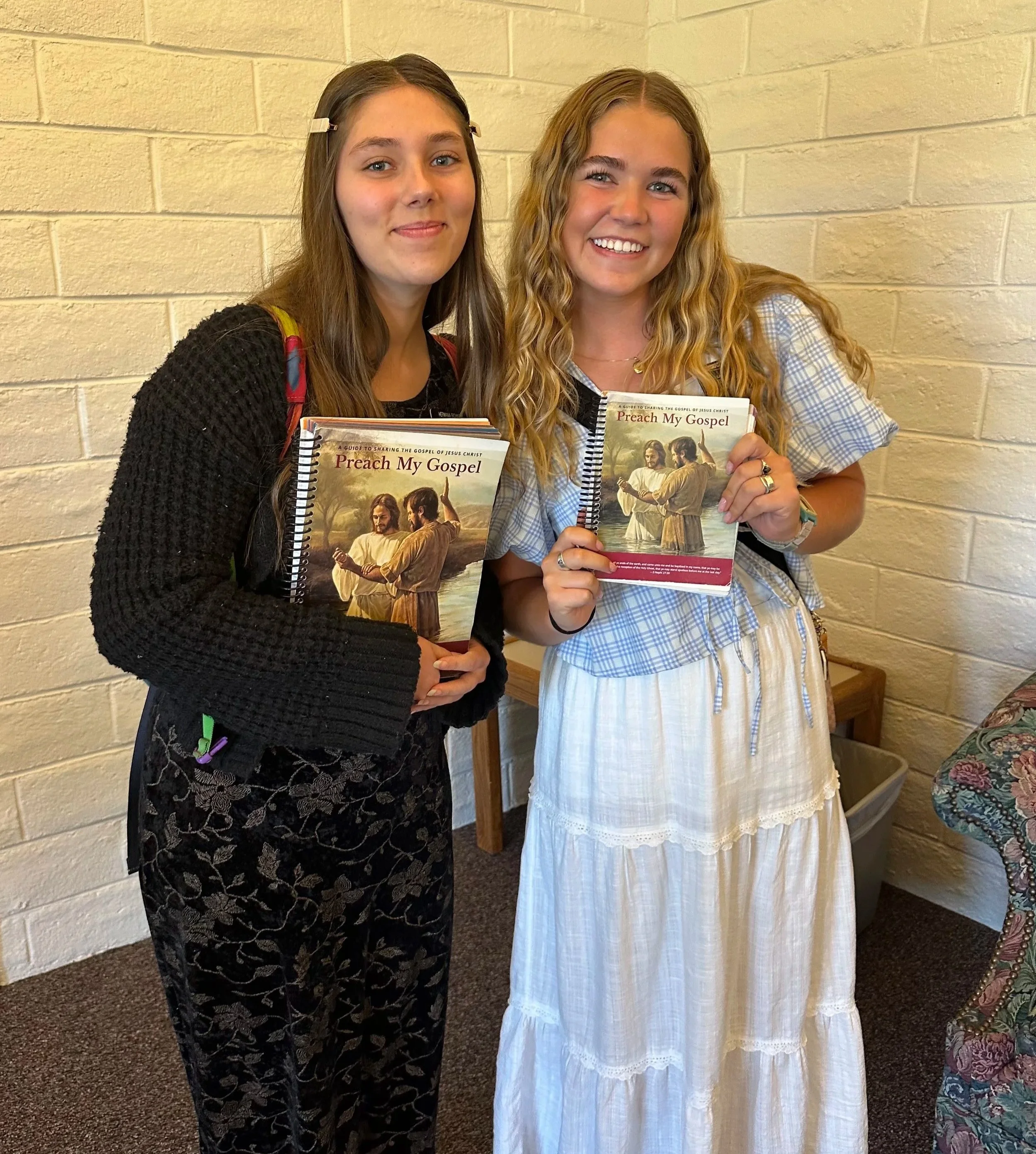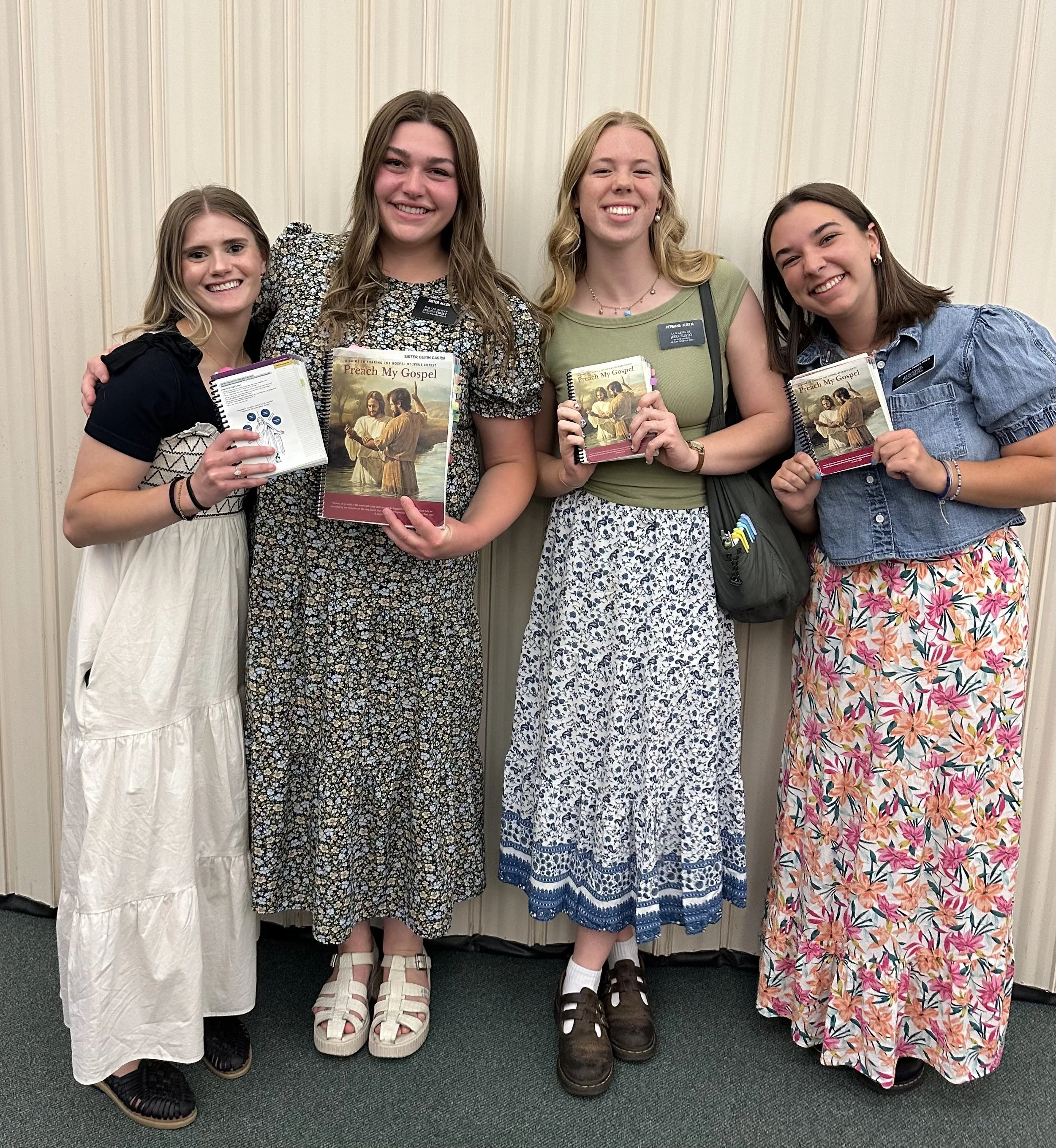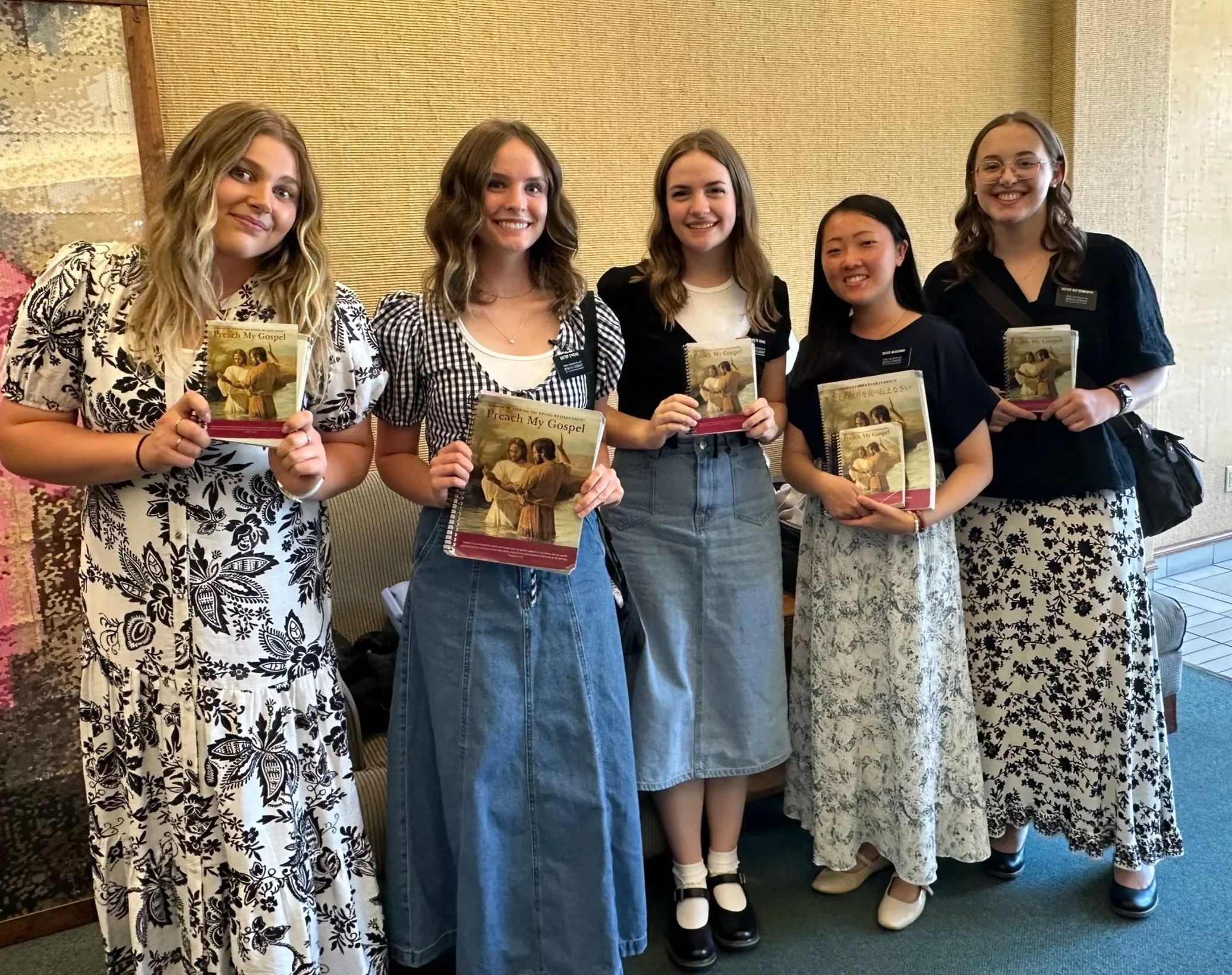 Sisters Bartlett and Gordon, Hermana Grose, Sisters Freeman and Jones holding their copies of “Preach My Gospel”