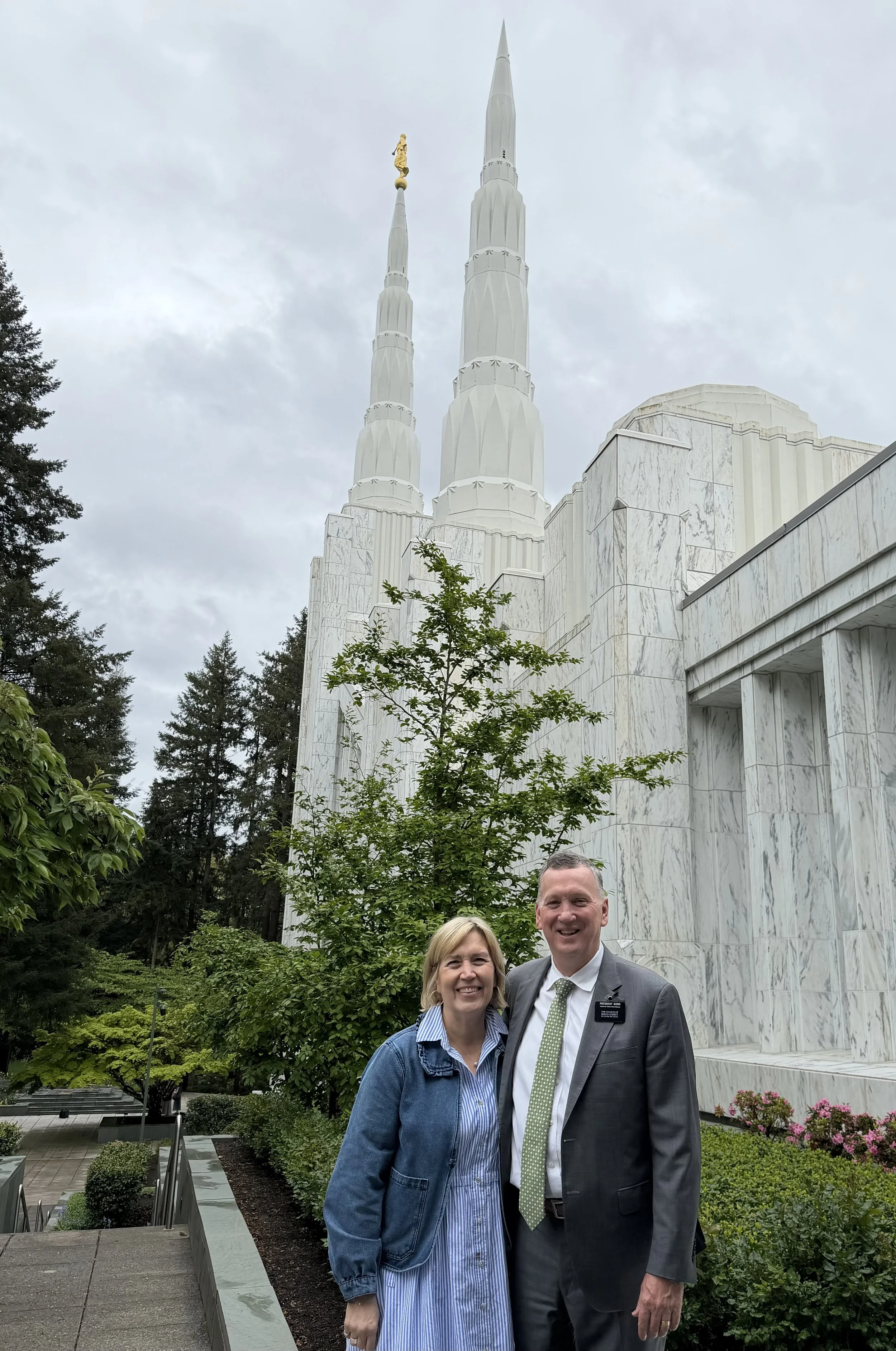 Sister and President Quinn at the Portland Oregon Temple on a cool rainy day in April