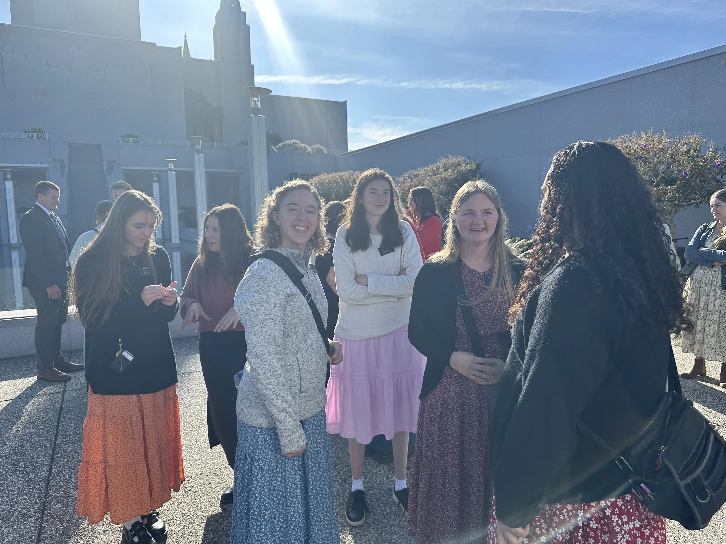 Missionaries enjoying walking around the temple. Sisters Knotts, Moon, Beattie, J. Williams, Hankins and Alusa.