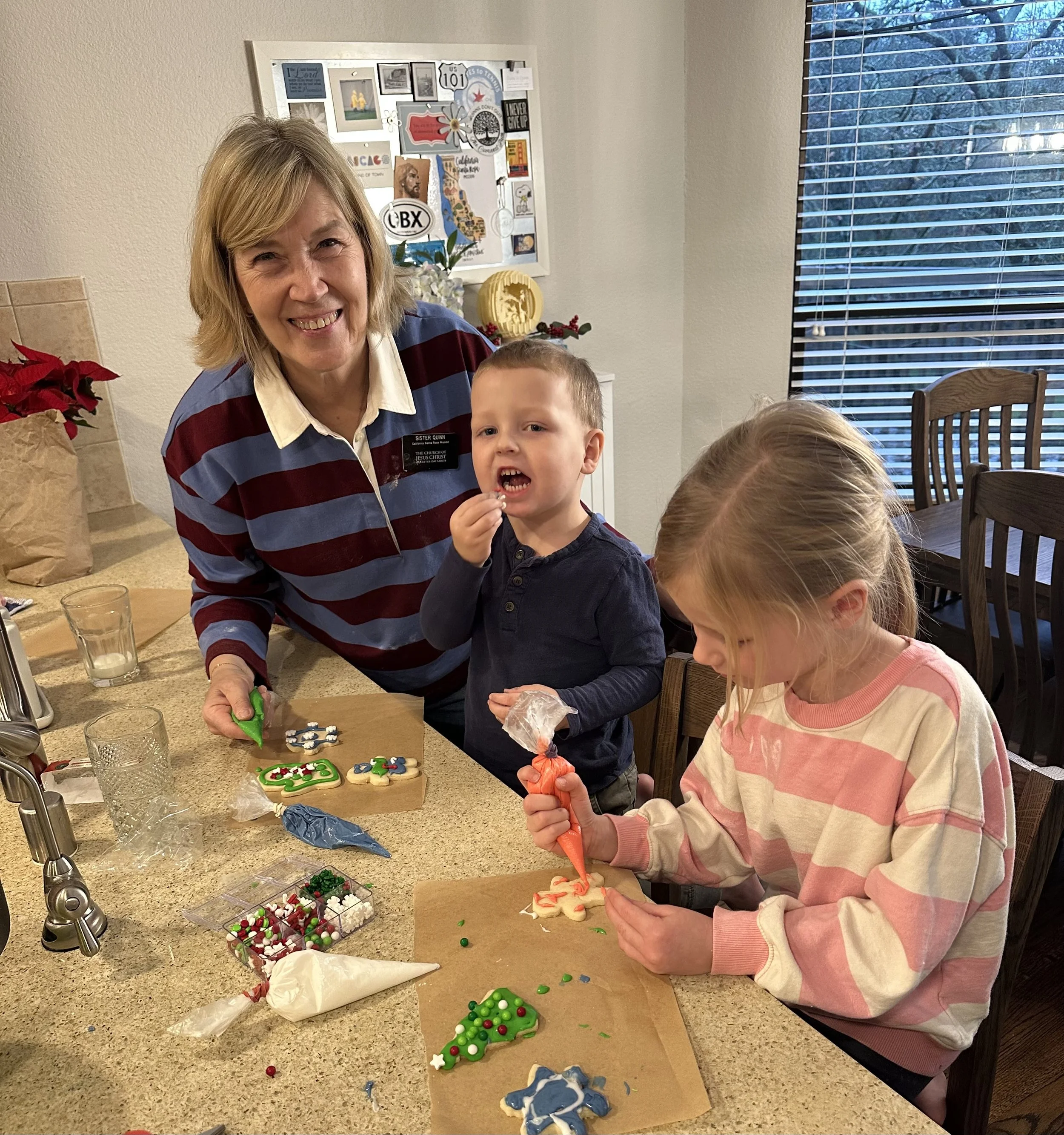 Our Christmas week began in a wonderful way when we drove to SFO to pick up our daughter Hannah and her darling three children, our grandchildren, Elaine, Sam, and Alice, who had flown in from Dallas, Texas. Her husband, Ken, arrived the following day. We were so happy they could come and spend Christmas with us. I had been looking forward to their visit and was especially excited to bake and decorate Christmas cookies with Elaine and Sam. I had learned some fun cookie-making and decorating tips from our bishop’s wife, Ann Brown, who owns a cookie decorating business, and I couldn’t wait to use my new decorating supplies. I also looked forward to playing games, wearing matching Christmas pajamas, and singing carols under the Christmas tree. And we did it all.