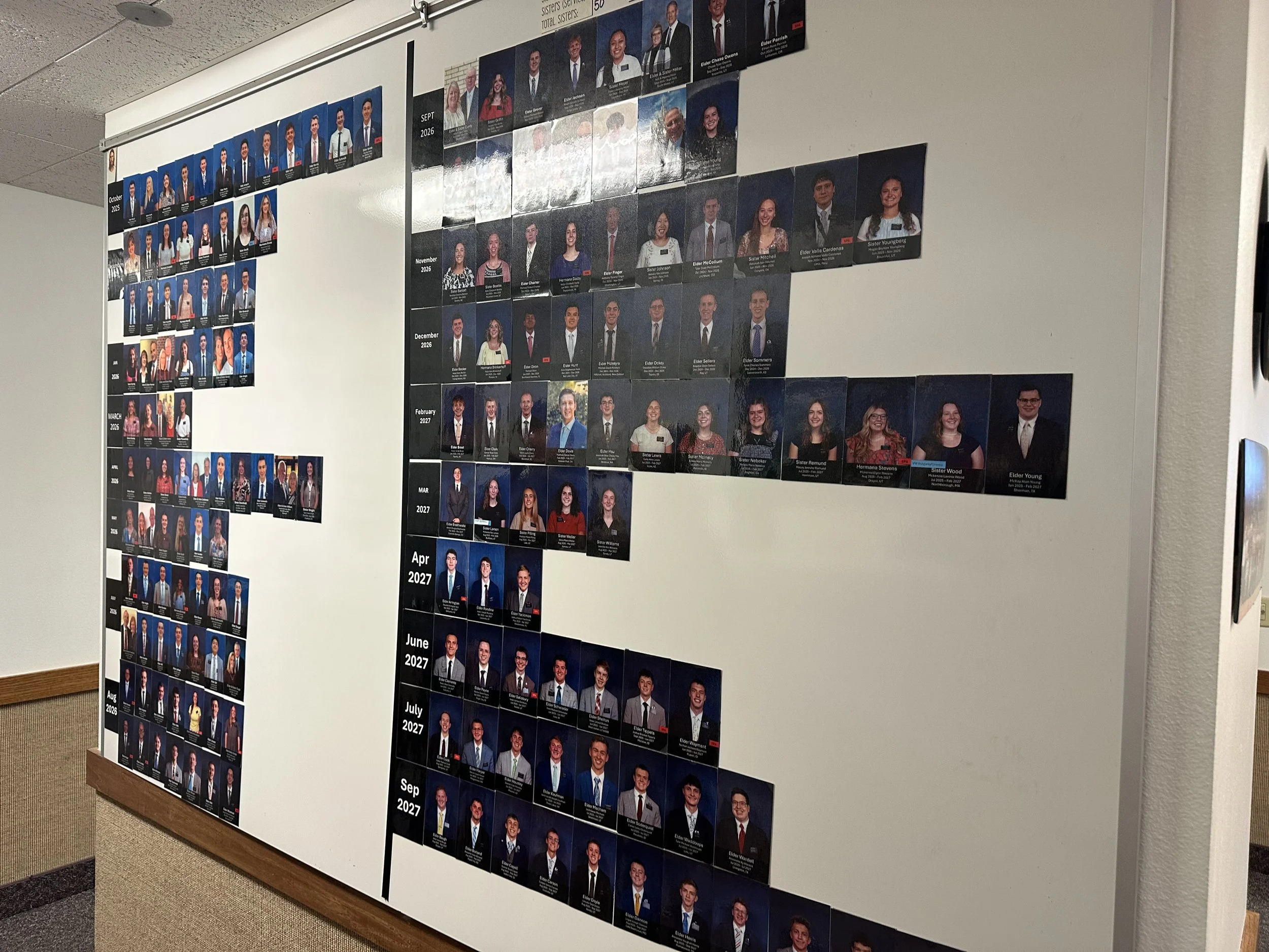 The office is just the right size for our needs, and we recently brightened it up with a fresh coat of paint and some new artwork. In the office a favorite spot for missionaries is the area around the advancement board. That’s where they gather to look at the photo magnets arranged by departure date. They love seeing who’s heading home next and are always surprised to see how quickly their own photo is moving forward. They love to tease each other by moving the magnets around much to Sister Nate’s chagrin who organizes them not only by date but also in alphabetical order.