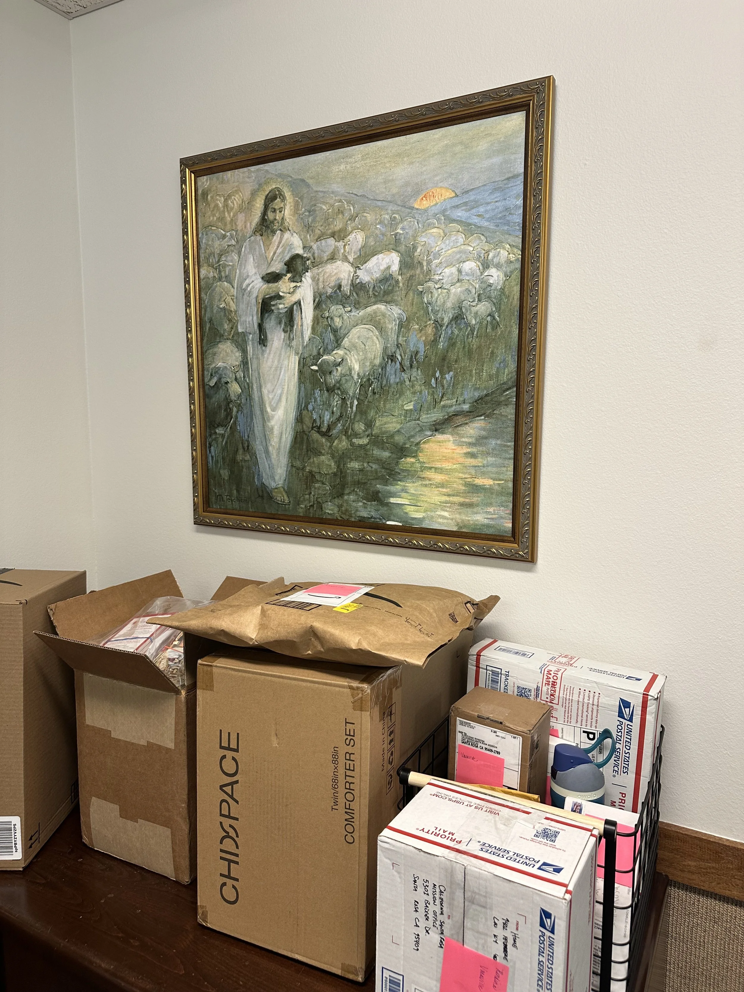Office area where packages from home are kept for the zone leaders to pick up to take back to the missionaries in their zones. This art work of Minerva Teichert’s - “The Rescue of the Lost Lamb” is one of my favorites!